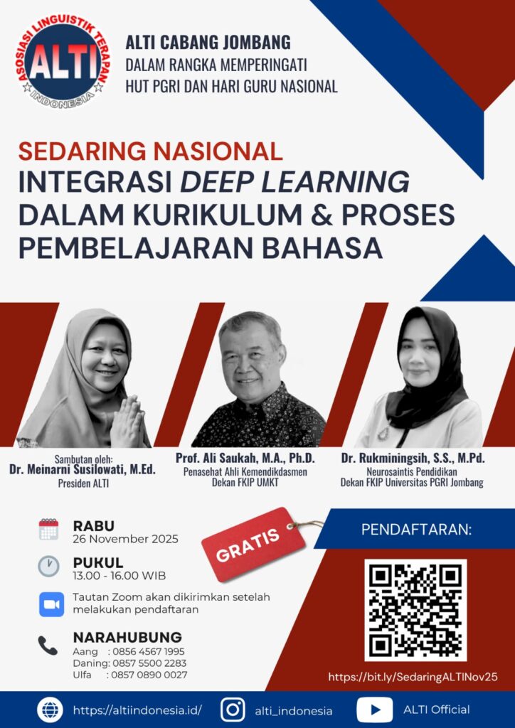 Dalam rangka memperingati HUT PGRI dan Hari Guru Nasional Asosiasi Linguistik Terapan Indonesia (ALTI) cabang Jombang bekerjasama dengan Departemen Akademik ALTI Pusat sukses menyelenggarakan Sedaring Nasional ALTI 2025 dengan tema “Integrasi Deep Learning dalam Kurikulum dan Proses Pembelajaran Bahasa” pada Rabu, 26 November 2025. Kegiatan yang berlangsung secara daring melalui Zoom Meeting ini menghadirkan dua pakar nasional di bidang pendidikan dan neurosains pendidikan.